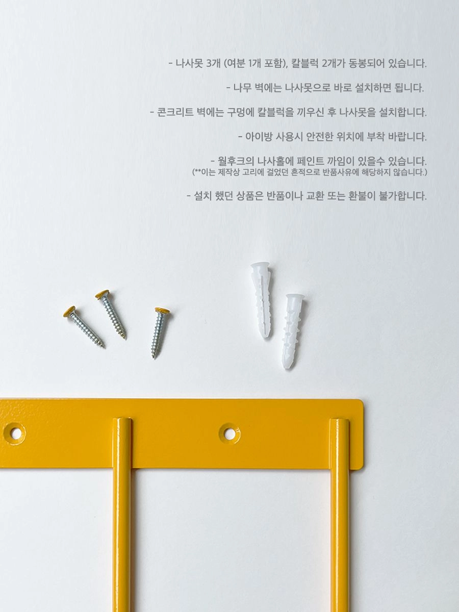 • Painted screws (in matching colors with the wall hook) and wall plugs for concrete installation are included.